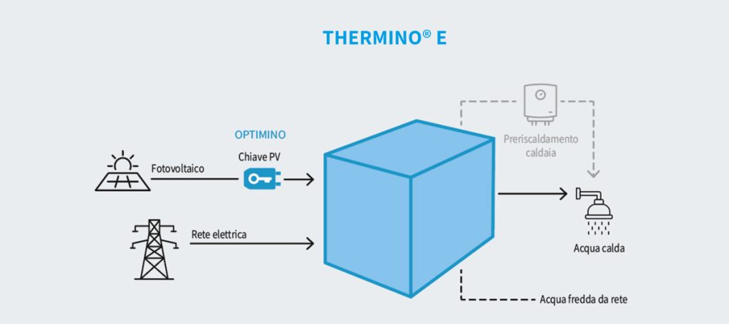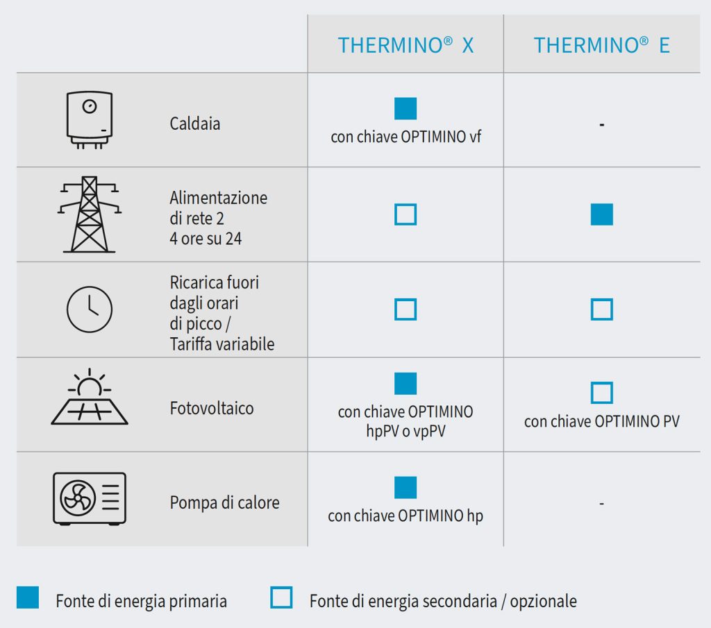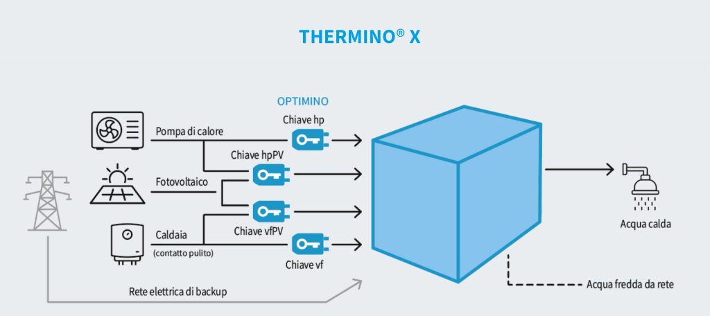 La chiave Optimino permette di convertire il sistema di riscaldamento di Thermino da alimentazione elettrica da rete a diversi tipi di alimentazione: Fotovoltaico, Pompa di Calore, Caldaia.